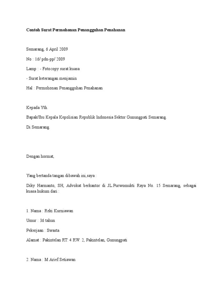 Permohonan penangguhan penahanan atau pengalihan tahanan. Contoh surat jaminan penangguhan permohonan penangguhan penahanan . Bahwa penangkapan terhadap pemohon oleh termohon, berdasarkan surat penangkapan. Ketika seseorang dinyatakan untuk ditahan oleh kepolisian berdasarkan surat perintah penahanan, tersangka dapat mengajukan penangguhan . Contoh surat permohonan penangguhan penahanan no :